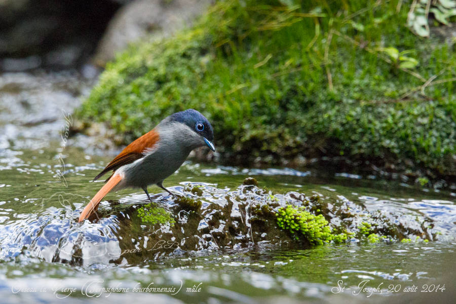 Oiseau la Vierge (Terpsiphone bourbonnensis) mâle cherchant des insectes dans une ravine